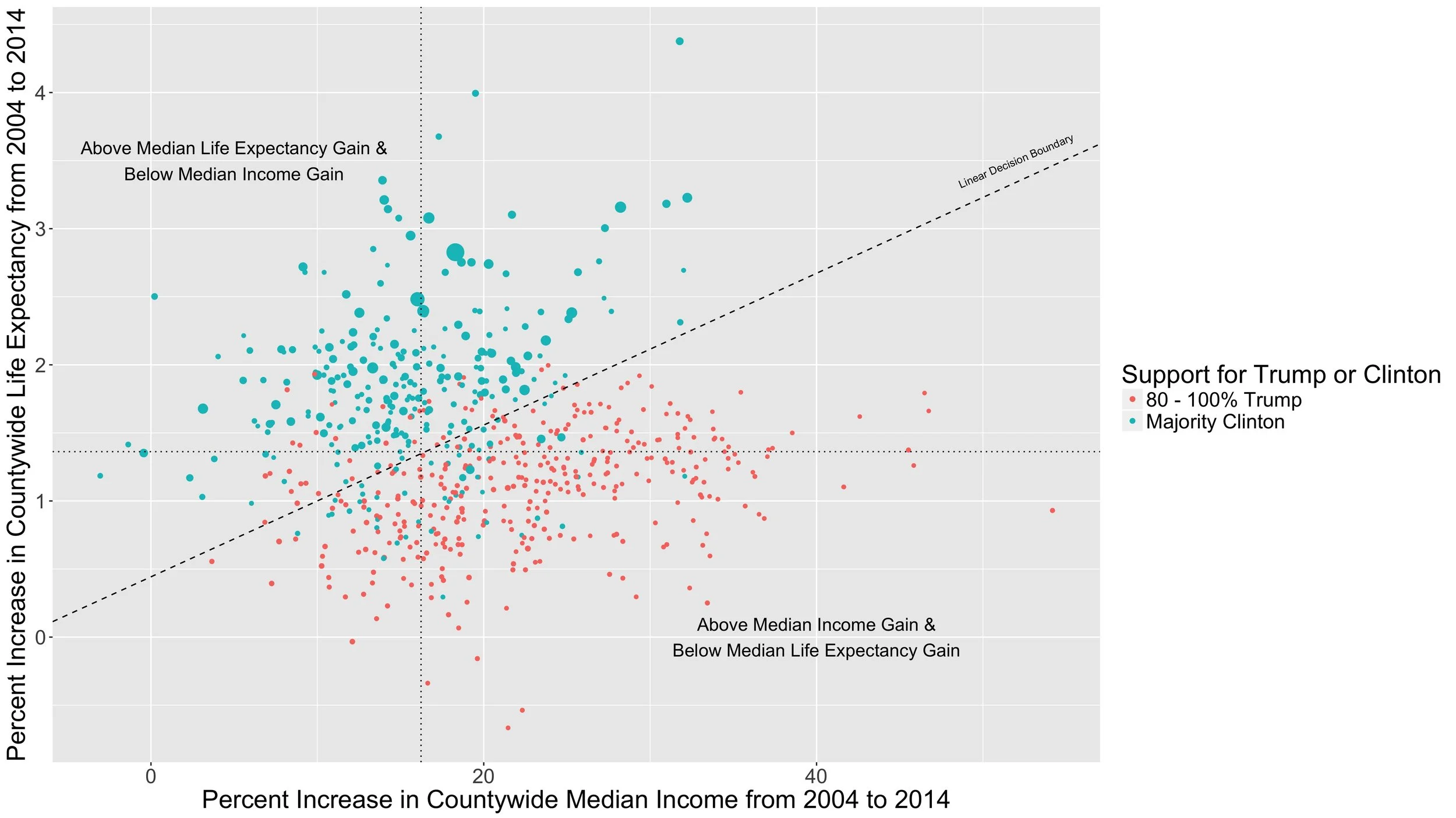 Now we're seeing something. Basically, the Trump-voting counties got wealthier from 2004 to 2014 while the Clinton-voting counties got healthier. (To be a little more precise, because very few counties got either less wealthy or less healthy, the Clinton counties generally saw larger life expectancy gains than the Trump counties, while the Trump counties generally experienced greater income gains than the Clinton counties.) The dashed, diagonal line, generated from a logistic regression, does a nice job of separating the Clinton counties from the Trump counties based on life expectancy and income changes.